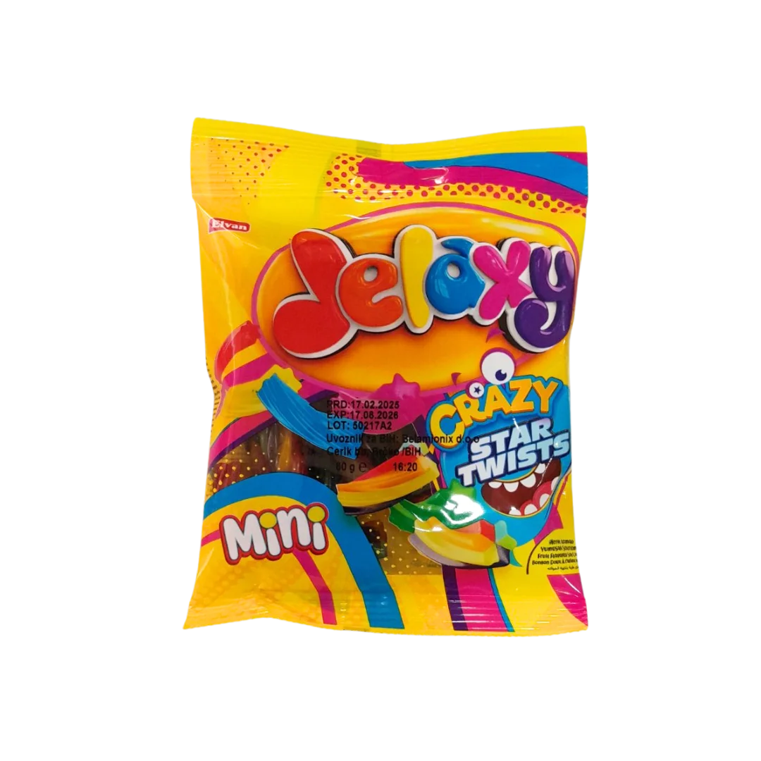 Jelaxy mini crazy star twists 80g Elvan donose eksploziju voćnih okusa u svakoj šarenoj zvjezdastoj trakici, savršeno dizajniranoj za uživanje u svakom zalogaju. Ovaj neodoljivi slatkiš pruža zabavu i radost djeci i odraslima, čineći ga idealnim izborom za grickanje u pokretu ili dijeljenje s prijateljima.
